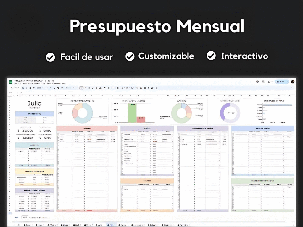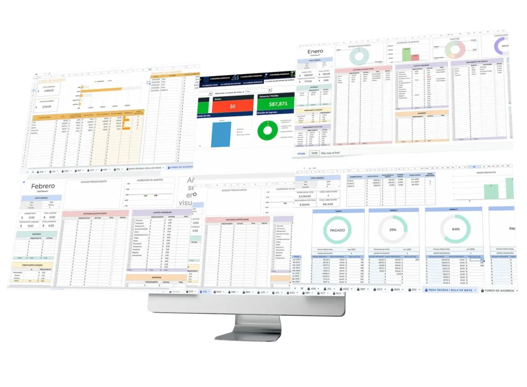 Solo vendemos una plantilla de finanzas personales en formato hoja de cálculo (archivo digital editable) para que tú mismo registres y organices tus ingresos, gastos, ahorros y pagos.